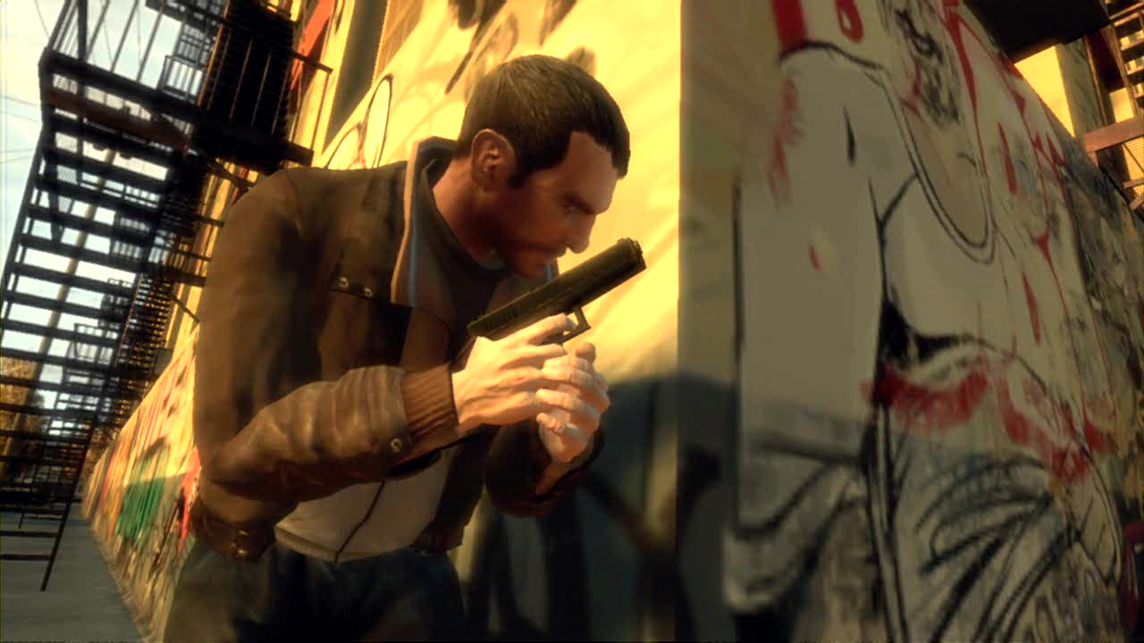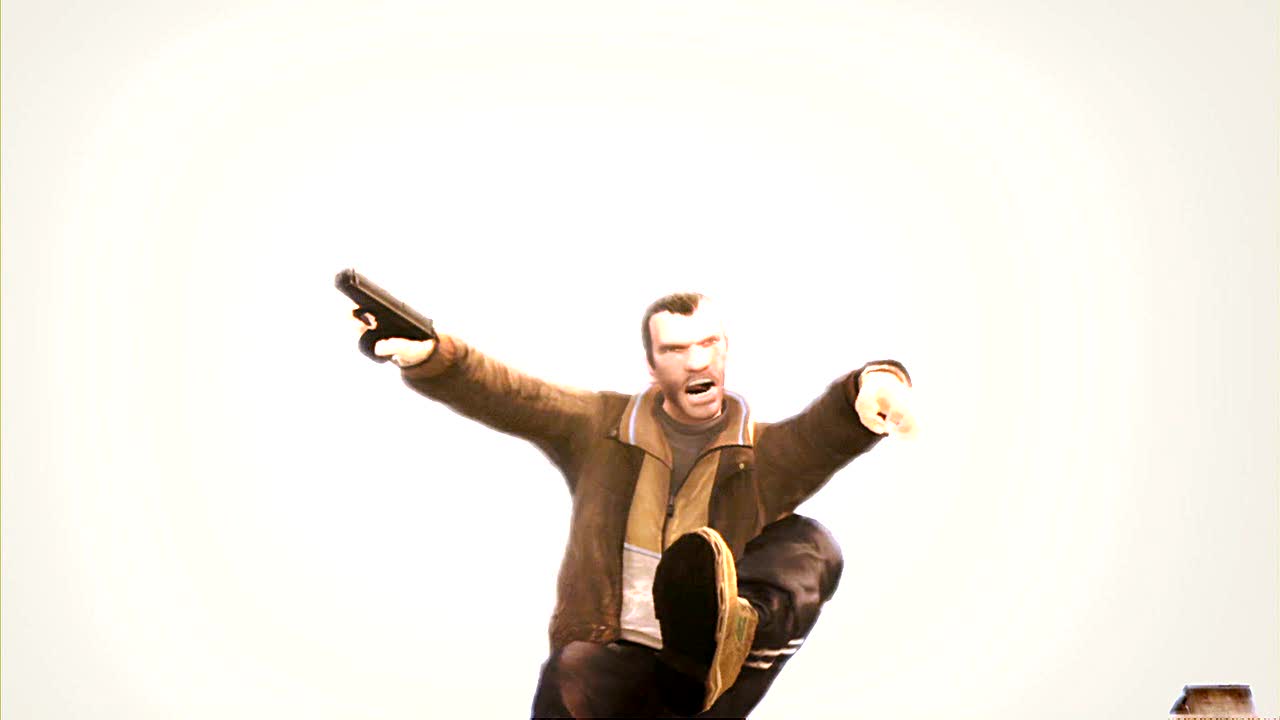 Pak už si to Niko sviští na motorce po jednom z mostů, tato motorka se podobá PCJ-600 z předchozích GTA, a kupodivu má na hlavě přilbu. Vedle něj jede posprejovaná dodávka. Načež už je záběr nejspíše z doků, kde je vidět v pozadí "ruské kolo" a všude do kola létají rackové a v popředí stojí žena (mladá blondýnka) a s rukama v sepětí říká: "PLEASE, NO MORE KILLING" (prosím, už nezabíjejte). Přitom už záběr ukazuje jak se Niko plíží s pistolí v ruce (glock) podél zdi k rohu ulice, jenž je ozdobená obrázkem El Burra z GTA III a celá posprejovaná zajímavými grafity.