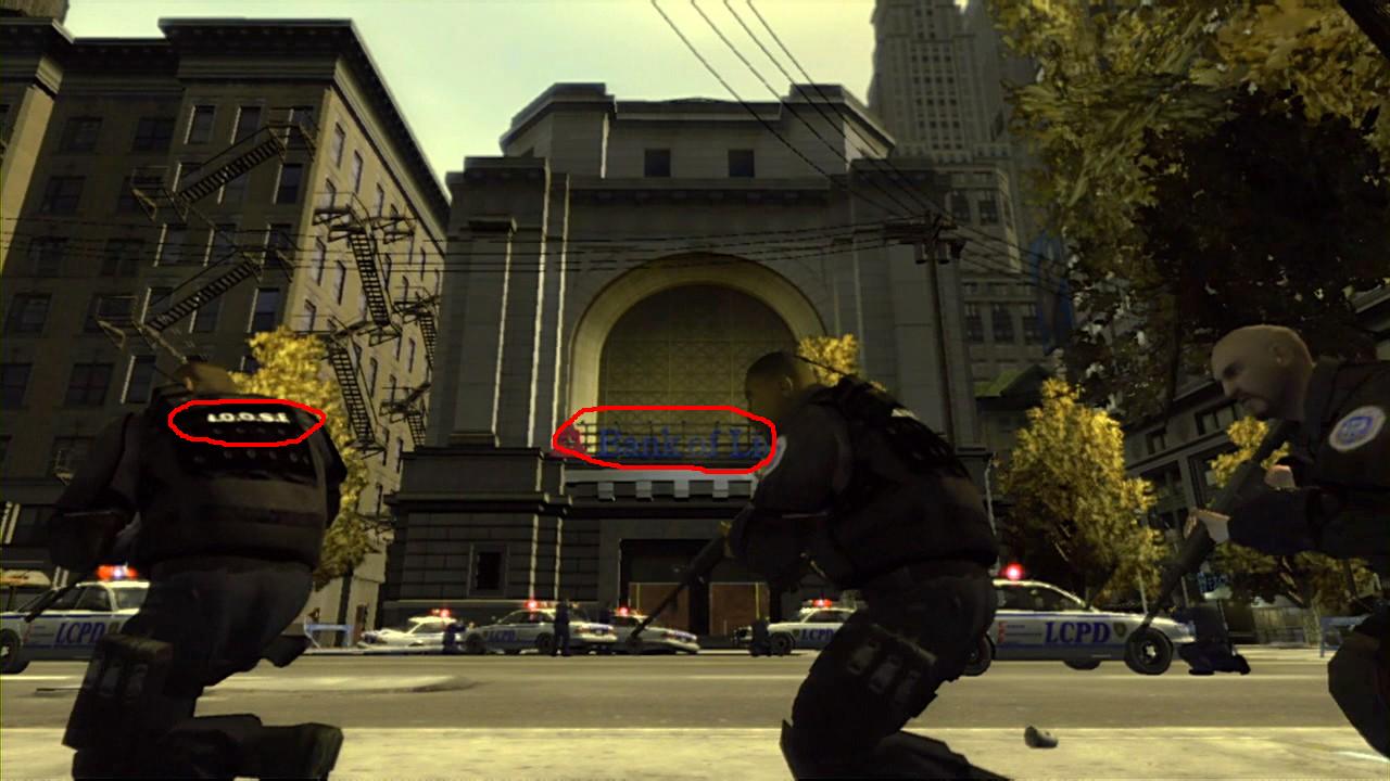 4) Při záběrech policejního zásahu u banky jsou tu hned dvě zajímavosti a to, že banka se s největší pravděpodobností jmenuje "Bank of Liberty" a zásahová jednotka má označení N.O.O.S.E. (jak už jsem podotkl v popise traileru jenž jsem ale měl zkreslený obraz a viděl jsem K.O.O.S.E., ale díky detailnějším záběrum a také Lukáše Zemana je to potvrzeno).