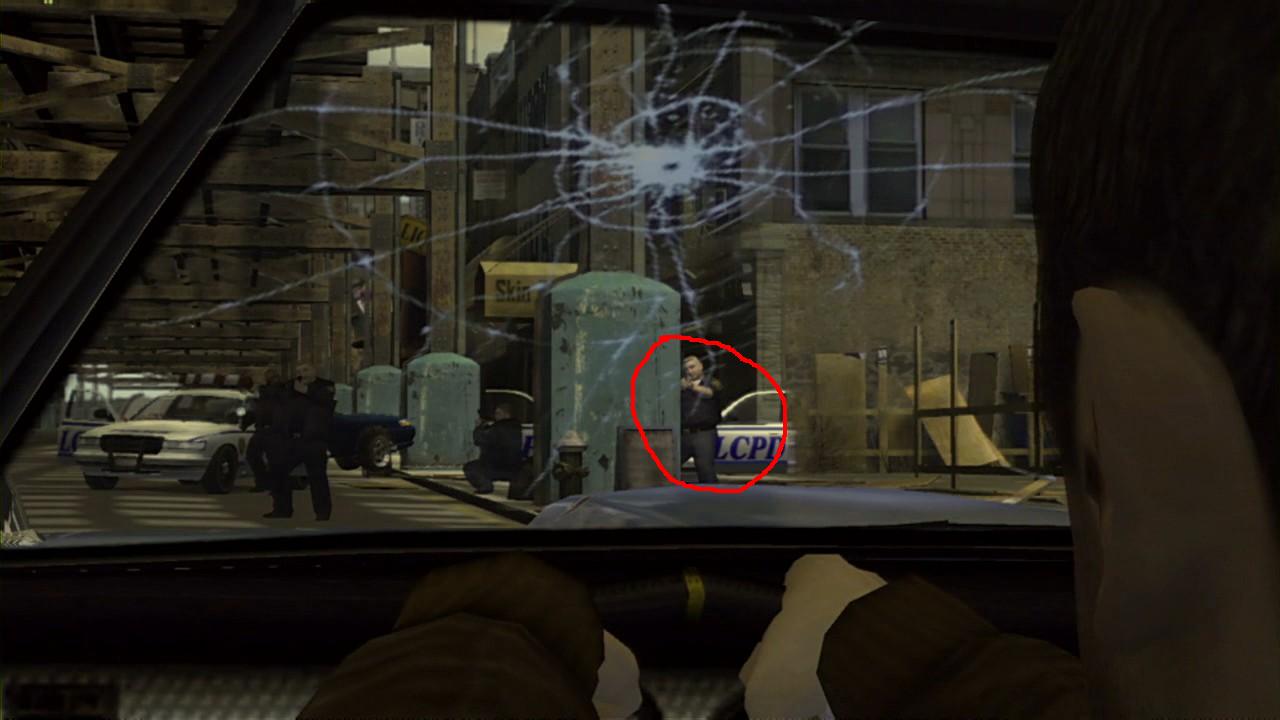 6) Při jednom záběru jak efektivně policisté rozstřílí Nikovi čelní sklo auta jsem zahlédl jednoho policistu, který vypadal jako "Pulaski" z GTASA. Je to určitě schoda náhod poněvadž příběhově to nemůže mít souvislot poněvadž v GTASA jste Pulaskiho zabili.